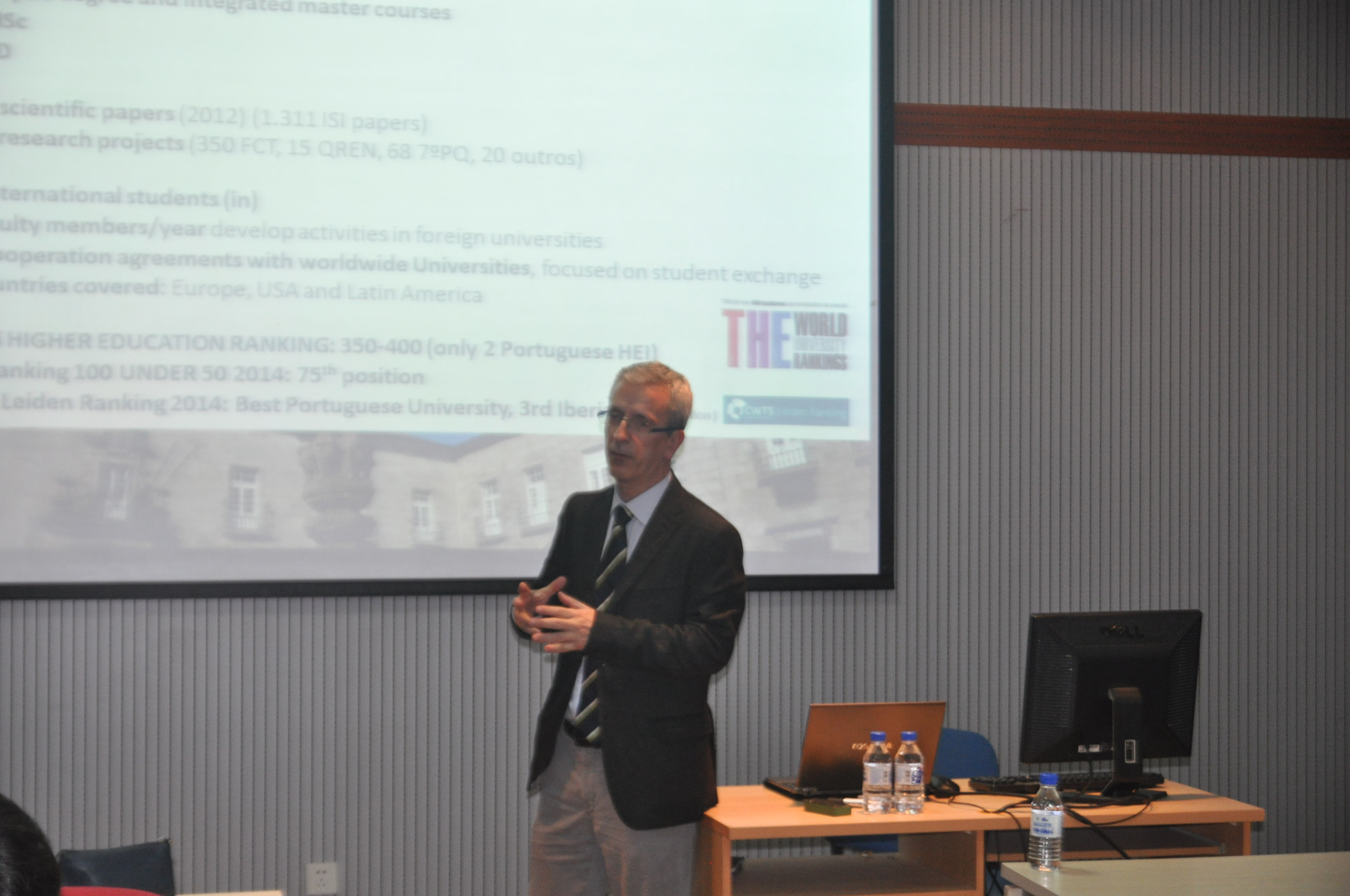 Monteiro教授首先介绍了葡萄牙米尼奥大学工程公司的基本概况,并着重介绍了公司的研究成果以及科研项目的进展情况。随后,Pereirao教授详细介绍了葡萄牙米尼奥大学Algoritmi研究中心在信息和通信技术以及电子领域的研发工作,具体包括电子工程、电子和纳米科技、运筹学、统计和数值方法、信息系统、软件和多媒体、计算机网络和普适计算等多个领域的研究进展。两位教授分别结合其正在主持和参与的欧盟科研项目讲述了物联网和嵌入式系统领域的多个热点问题。