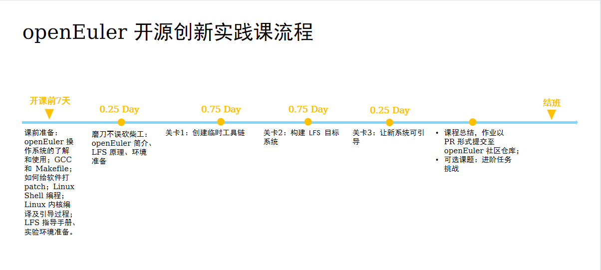 课程目标:学习掌握操作系统内核、基础库、工具链等的编译安装、文件系统构成及启动引导流程,培养员工动手实践能力;进入开源社区学习、开发,了解开源软件开发理念。