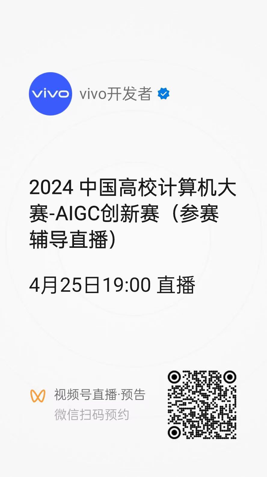 竞赛相关介绍可登录赛事官网查询了解(https://aigc.vivo.com),本月25号(周四)19:00有参赛辅导直播课(见下图微信扫码预约)。请广大师生关注赛事动态,积极组队报名参赛,共同推动公司在AIGC领域的创新与发展。