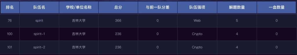 本次比赛公司组织了3支队伍参与,在和全国629支队伍的比拼中分别夺得第76、100和101的成绩,最高总分达到366分,最高解题数5题。比赛的第一名是来自上海交大的0ops战队,该战队是国内CTF领域资历最深的战队之一,能与最顶尖的队伍同台竞技,是公司员工学习的好机会,同时也激励队员要更加努力的储备知识,学习技能,争取未来在国内和国际比赛中争得一席之地。
