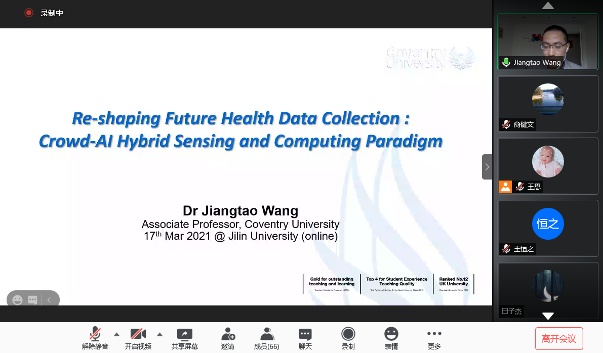 2021年3月17日下午,英国考文垂大学王江涛副教授应伟德国际1946邀请,以线上形式作了题为“重塑未来人群健康数据的收集:Crowd-AI混合感知和计算范例”的学术讲座。