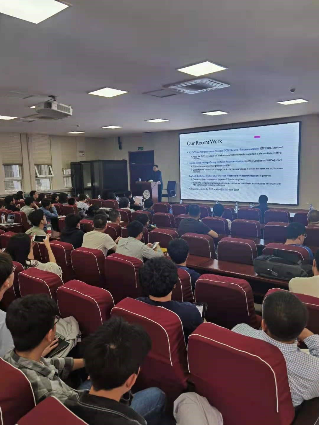 在本次讲座中,程老师主要向大家介绍了关于图网络推荐模型的几项工作。第一项工作展示图卷积网络方法在解决属性感知推荐系统中的关于属性缺失问题的优势;第二项工作提出了一个新的IMP-GCN推荐模型。该模型将图卷积过程中的信息传播约束在相似用户之间,从而缓解过度平滑问题;第三项工作提出建立高阶邻居之间的直接连接并采用单层GCN来学习节点表征,从而简化模型提高学习效率。实验结果表明该单层GCN模型可以取得与多层GCN模型相当的推荐精度。会议最后阶段,老师悉心回答了到场同学的提问。本次报告受到了广大师生的热烈响应。