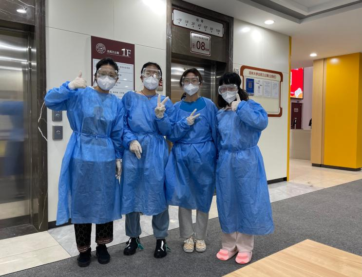 当志愿者们穿上防护服,北三公寓志愿者队的张爱琳感慨:“那是我们第⼀次感受防护服里的世界,脱下来的时候每个人都湿了头发,但大家依然开心能够贡献自己的⼀份力量”。公司高战国副书记与何老师亲赴一线,为同学们送来防疫物资,解决了送物资难,缺物资急的燃眉之急。
