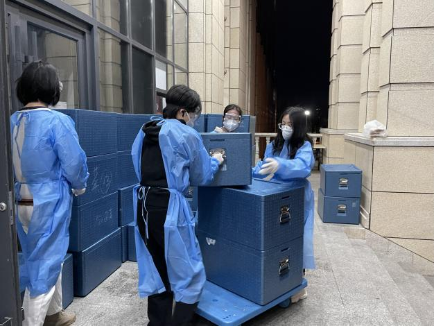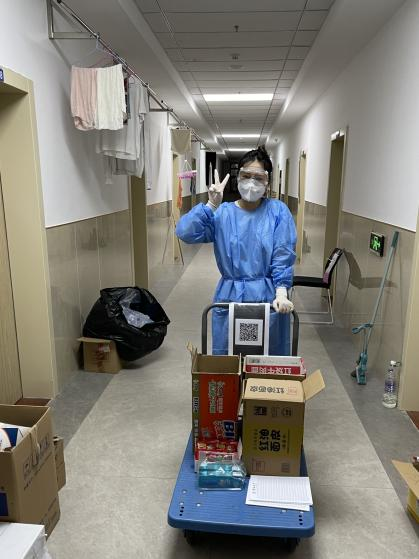 作为北三计算机公司研究生最艰难的是,大家寝室集中在一楼东面,从西门送入的物资无法直接送达,需要先上二楼东面再下一楼,在封寝管控的初期,志愿者们没有小推车,只能人工搬运沉重的饮用水和盒饭,这给本就身体纤弱的女生志愿者们的配送工作带来了不小的困扰。虽然在最开始有些手忙脚乱,但是志愿者们在防疫物资缺乏的情况下不怕辛苦,不畏艰难,往返数次搬运物资,用强大的战疫决心保障了配送工作顺利的进展。