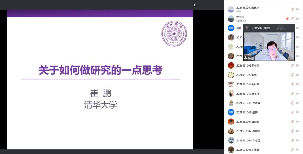 本期会议中,崔鹏老师为与会的500多名师生做了一场题材新颖、生动有序的学术报告,整场报告总计三个小时,两院师生认真听取同时积极参与讨论问答,在疫情封闭期间体现出了强烈的学术热情,充分诠释了两院师生在艰苦条件下踔厉奋发、笃行不怠的求学精神