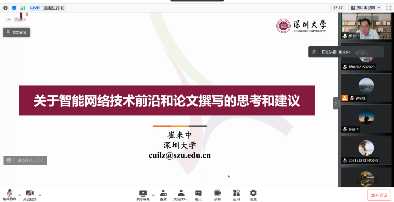 2022年4月20日晚六点半,伟德国际1946集团计算机公司研究生学术沙龙第十五期(线上特别版)暨《论文写作指导》课程第四讲顺利开讲,本期特别邀请到了深圳大学计算机与软件公司教授,博士生导师崔来中老师。崔教授以“关于智能网络技术前沿和论文撰写的思考及建议”为题目,为同学们带来论文写作指导课程的最后一讲,也意味着线上特别版研究生学术沙龙告一段落。