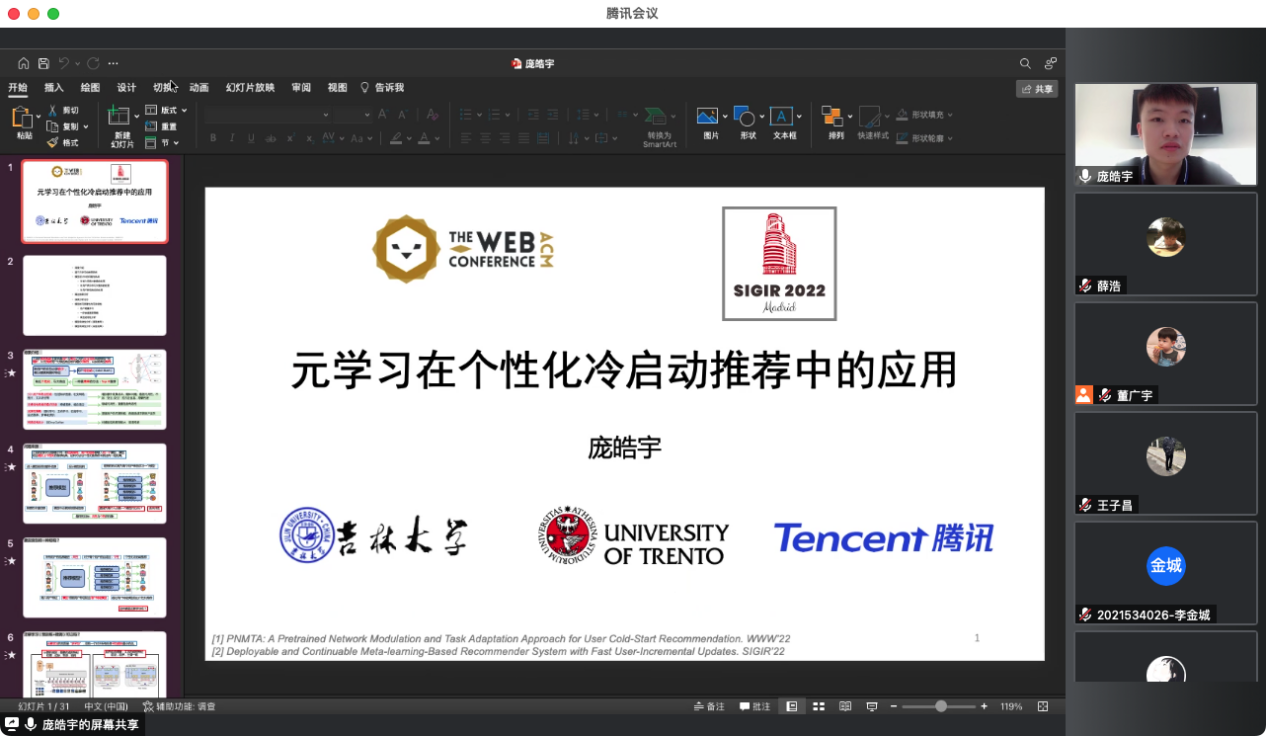 2022年5月6日上午9点30分,伟德国际1946第二届“研学论道”研究生学术沙龙第一期(总第十六期)顺利举办。王喆副经理出席了本期活动,王经理回顾了第一届学术沙龙取得的丰硕成果,并对第二届的成果统计数据给予充分肯定。他表示,第一届学术沙龙活动在公司产生了积极反响,并营造了良好的学术氛围,本次成果统计仅在4个月时间就涵盖了14篇A类成果,这一学期,公司将赓续上一届的沙龙精神,继续邀请在学术上取得优异成绩的同学做学术分享,为公司研究生打造一个更好的科学研究与学术交流的平台。本期邀请了2020级硕士生庞皓宇和2020级硕士生刘永皓进行学术分享,他们分享的主题分别是“推荐系统”和“图表示学习”。本次分享由伟德国际1946研究生会干事王子昌主持,受疫情影响,活动采取线上形式进行。公司各级同学踊跃参与并积极提问,充分体现了公司学子对学术的热忱和求知的渴望。