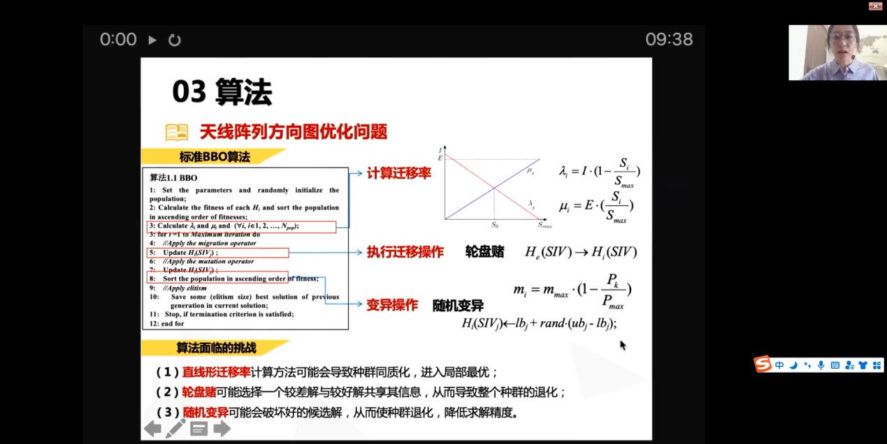 会议上半场,由讲者梁爽针对“天线阵列旁瓣抑制和充电无人机部署优化问题研究”为我们带来两篇学术论文分享。第一篇论文中,讲者首先描述了天线阵列优化具有有效提升系统容量、增益以及通信能效的好处,而后引入该优化中的主要问题——辐射方向图优化,并给出讲者团队的优化方案。该方案在标准BBO算法的基础上提出了BBOIMAM算法,将原算法中的标准正弦迁移策略优化为广义正弦迁移策略,并在算法中分别加入了基于精英学的迁入策略以及基于弹性变异的自适应策略,最后通过不同阵元数量的天线阵列优化过程证实了该算法的有效性。在讲者的第二篇论文分享中,讲者针对传统WSNs中存在的能量受限问题,依次通过增加CUAV充电范围内传感器节点数量、最大化传感器节点和CUAV之间的充电效率以及最小化CUAV的总运动能耗,从而将多智能体的相互交互问题转换为全局优化问题,最终分别通过大规模和小规模场景下的实验分析表明了该算法较现有算法的先进性。