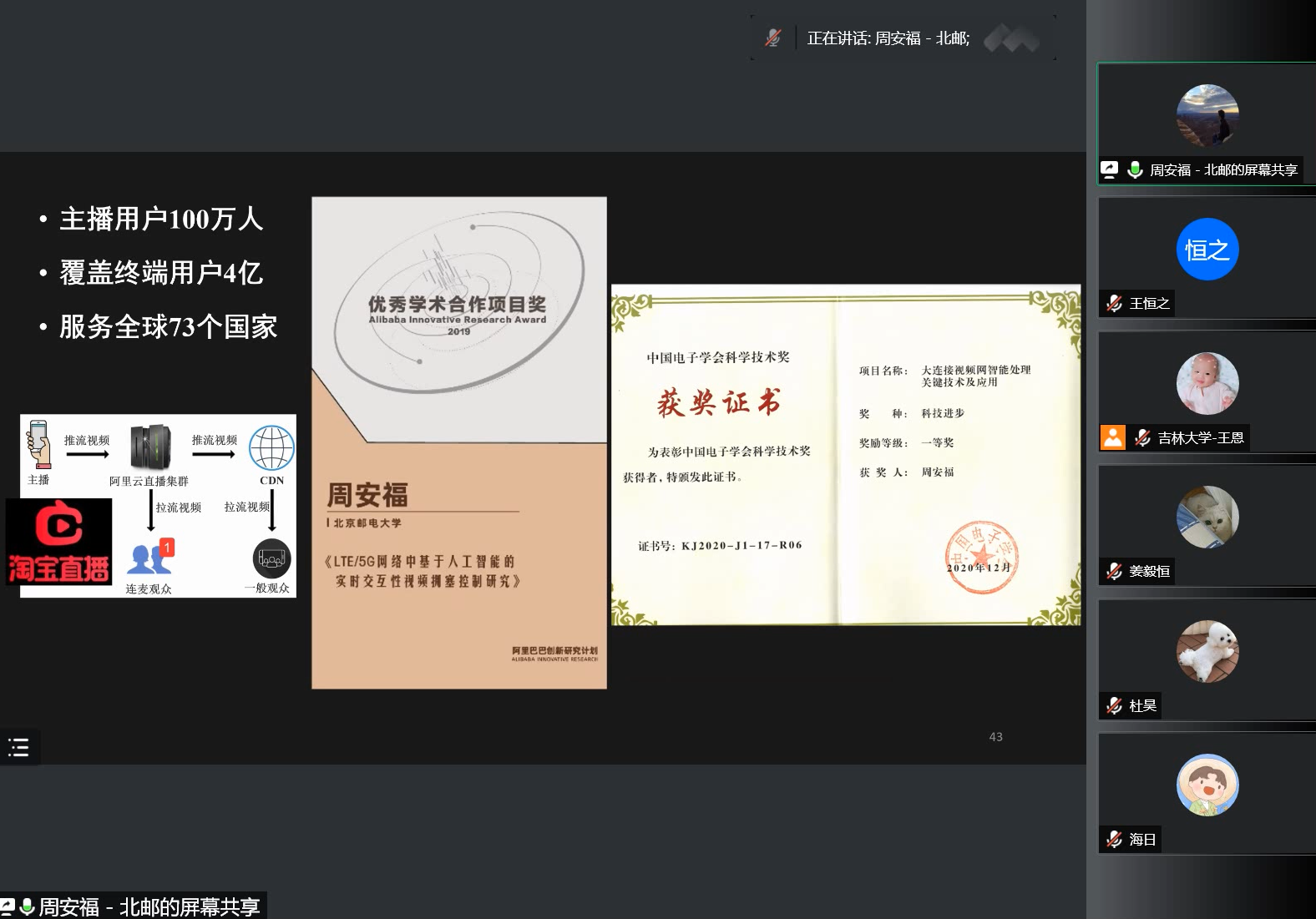 2022年6月2日上午9:30,北京邮电大学周安福教授应伟德国际1946邀请,利用腾讯会议作了题为“基于强化学习的低延迟视频传输研究”的学术报告。伟德国际1946王恩教授主持了讲座,并对周安福教授的精彩讲座表示由衷地感谢。