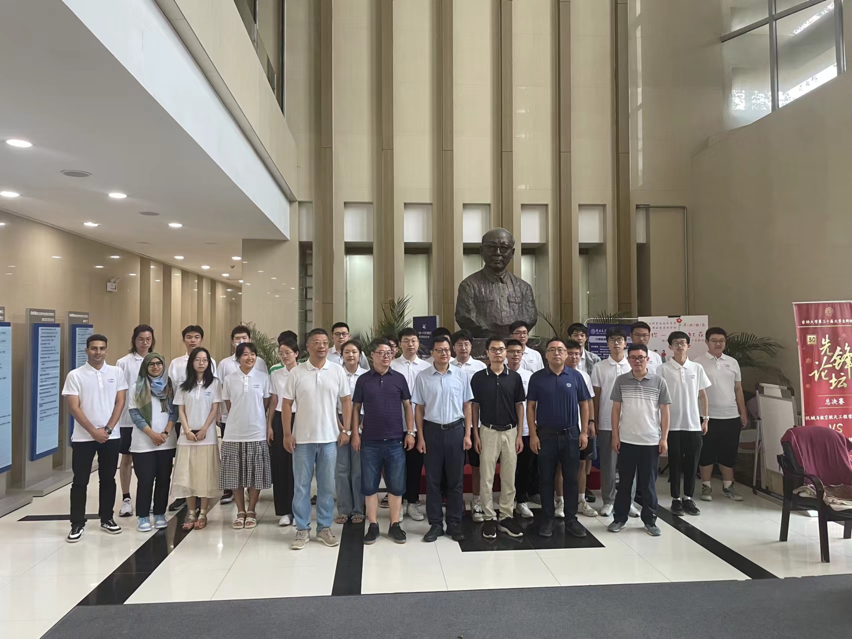 开班仪式结束后,杨博经理、张永刚副经理、张达鑫副书记、来自中科院软件所的蔡少伟研究员、李占山教授与同学们来到王湘浩先生纪念像前合影留念。