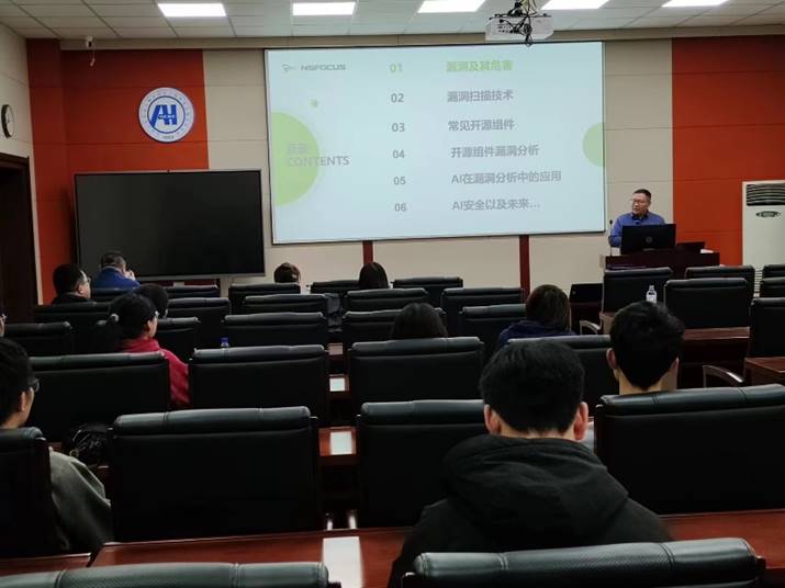 樊志甲经理首先对漏洞的概念和产生的原因进行了介绍;接下来,樊志甲经理详细讲述了常见开源组件类型、开源组件漏洞常见分析方法和开源组件漏洞的利用方式;最后樊志甲经理介绍了AI 在开源组件漏洞分析中的应用,并让同学们亲自进行了动手实践。本次报告让参会的师生受益匪浅,让大家更期待下一场的专家讲座。
