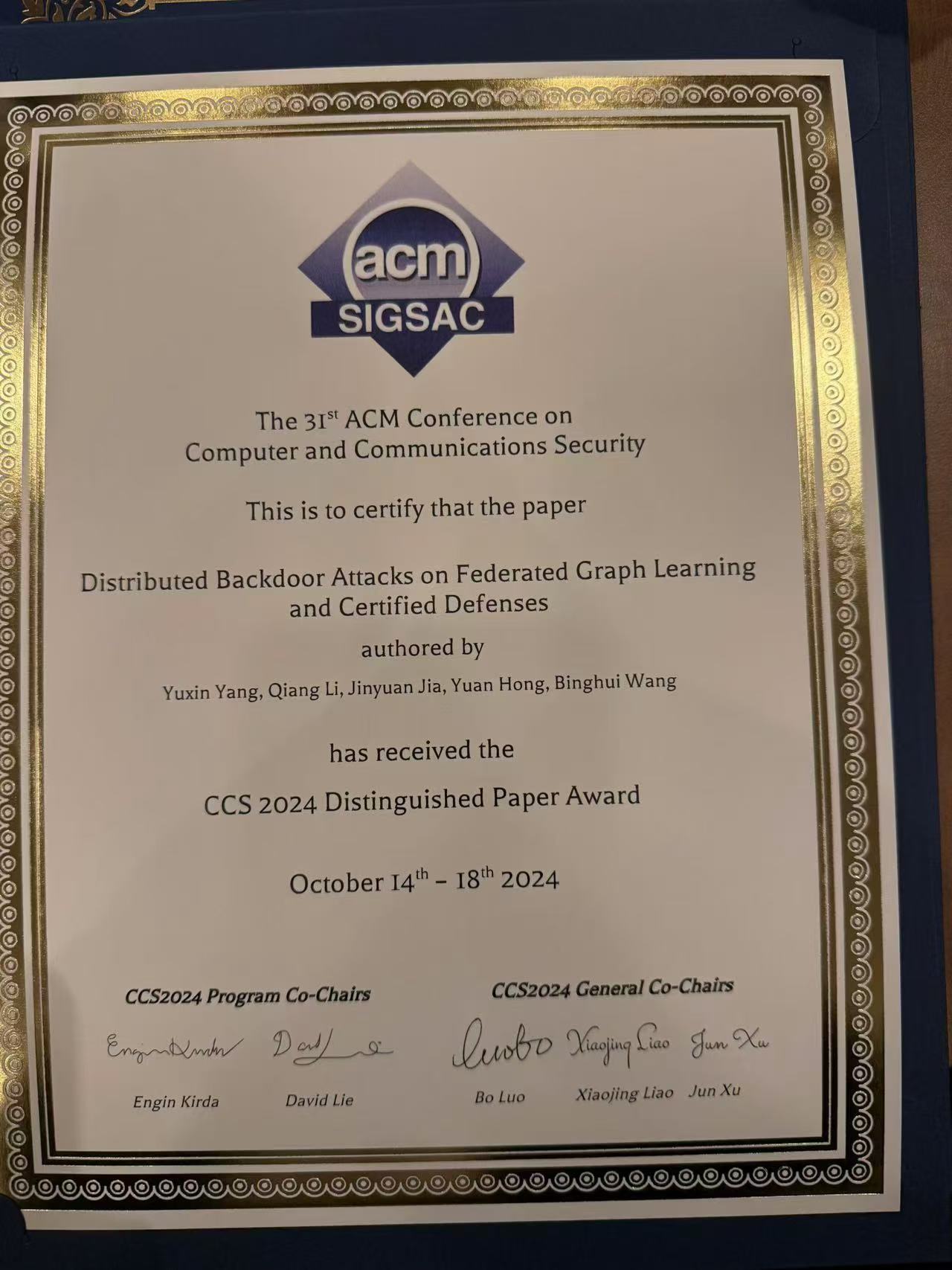 伟德国际19462022级博士生杨雨欣获得ACM CCS 2024(ACM Conference on Computer and Communications Security)最佳论文奖。ACM CCS是国际上网络与信息安全的四大顶会之一,是CCF推荐A类会议。