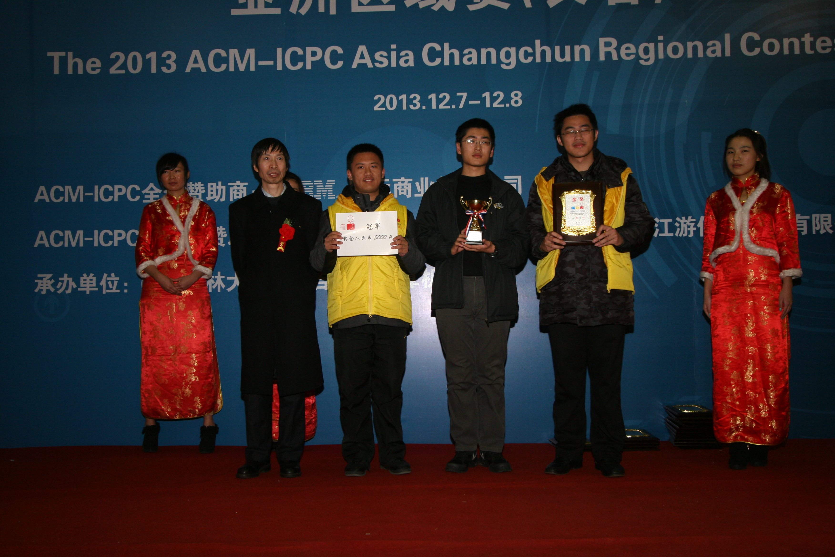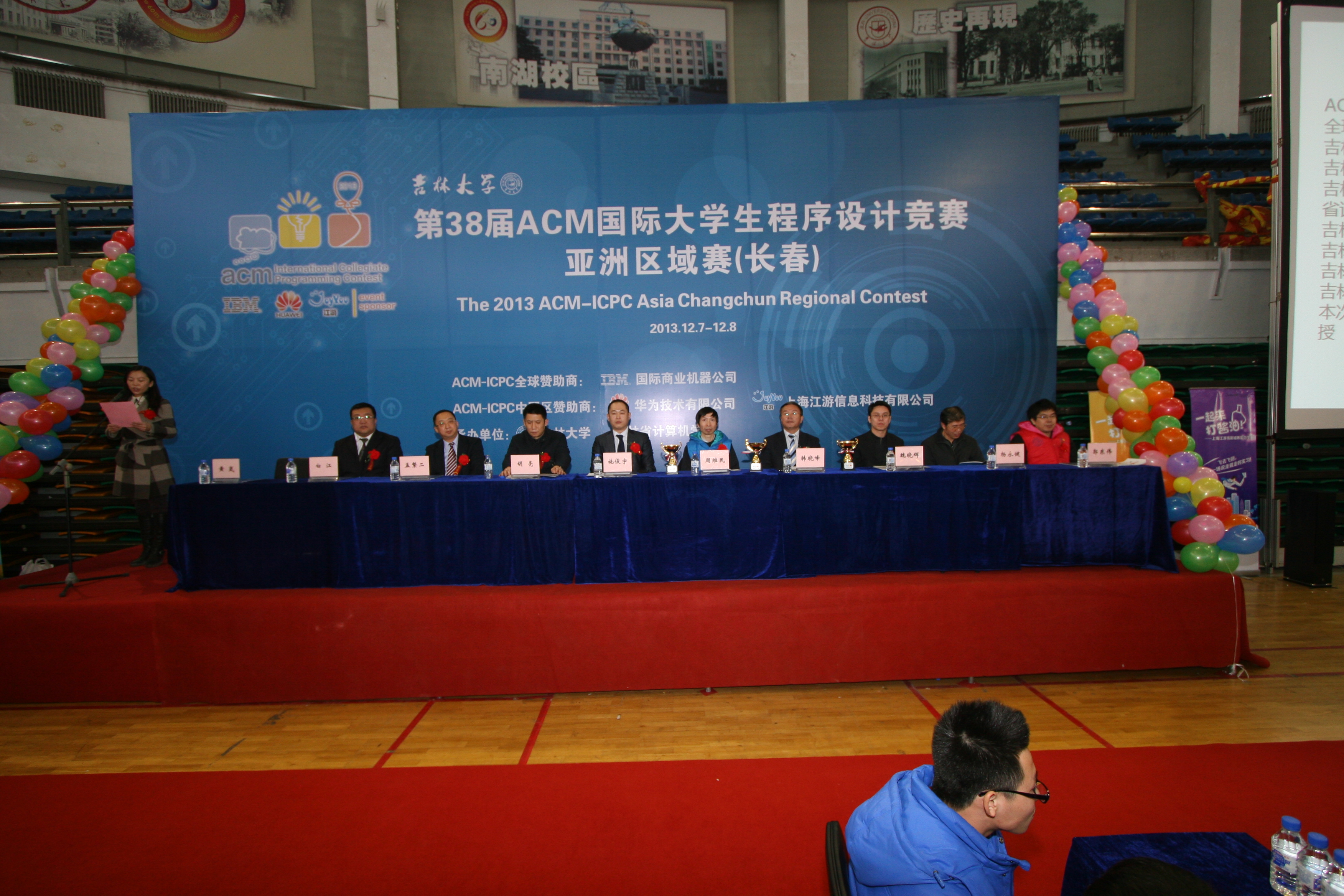 下午4点,第38届ACM国际老员工程序设计竞赛(ACM-ICPC)亚洲区域赛颁奖仪式正式开始,出席颁奖仪式的嘉宾有ACM-ICPC中国区指导委员会秘书长、上海大学周维民教授,华为技术有限公司北京研究所招聘经理白冰先生,上海江游信息科技有限公司人力资源部经理刑雪女士,伟德国际1946经理、软件公司经理、吉林省计算机学会理事长魏晓辉教授以及伟德国际1946和软件公司的相关领导。竞赛主裁判郭东伟教授对本次竞赛进行总结,大屏幕滚动显示参赛队伍排名及答题情况,郭教授宣读获奖名单,同时获奖代表队上台领奖。本次比赛有15支代表队获得金奖, 30支代表队获得银奖,63支代表队获得铜奖。比赛还设置了10个最快解题奖,2个顽强拼搏奖。获得竞赛冠亚季军的代表队分别是上海交通大学CamEo队、清华大学 LJQ队、 华南理工大学 SCUT_Yamiedie队,颁奖仪式在热烈和谐的气氛中结束。按照ACM-ICPC竞赛规则的安排,承办单位伟德国际1946集团和出题评判单位中山大学均不参加此次比赛。