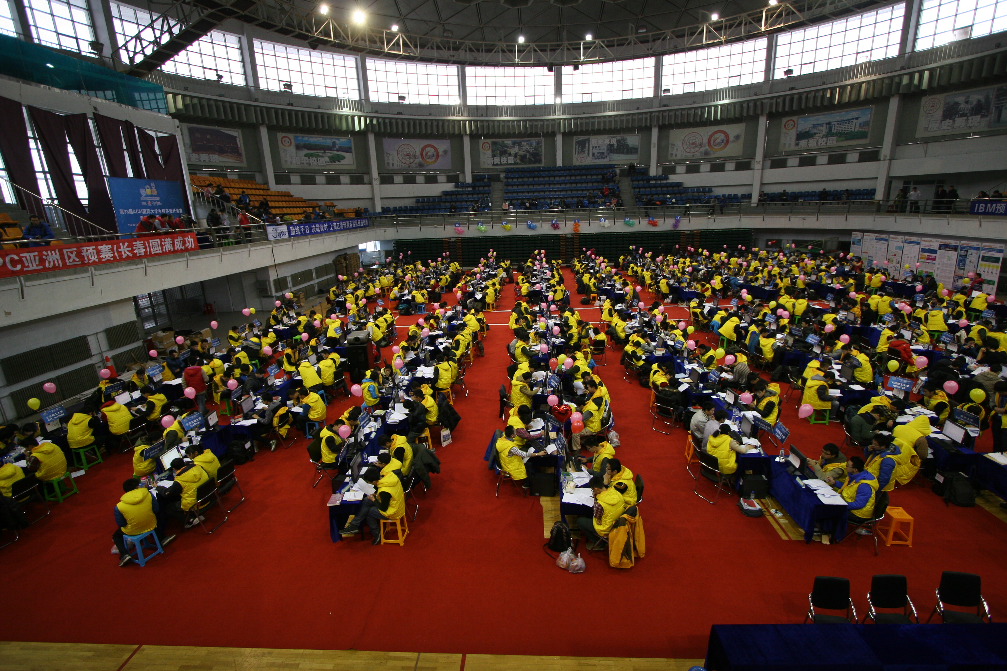 正式比赛于12月8日上午9点在伟德国际1946集团体育馆如期进行。每只队伍由3名队员组成,队员身着黄马甲在赛场比赛,教练身着蓝马甲在二楼看台观看比赛。比赛期间,每队使用1台电脑需要在5个小时内解决10道题,每道题对应不同颜色的气球,每答对一道题,身着红马甲的工作人员即在本队前方插上相对应颜色的气球。整个赛事紧张有序地进行。开赛仅2分钟,上海交通大学CamEo队解出了第一道题,获得第一个气球。随着赛事的推进,体育馆内彩球越来越多,场内气氛非常活跃。比赛进行到最后1小时赛事排名榜单停止了更新,场内气氛愈加激烈紧张,很多队员加紧了最后的冲刺。