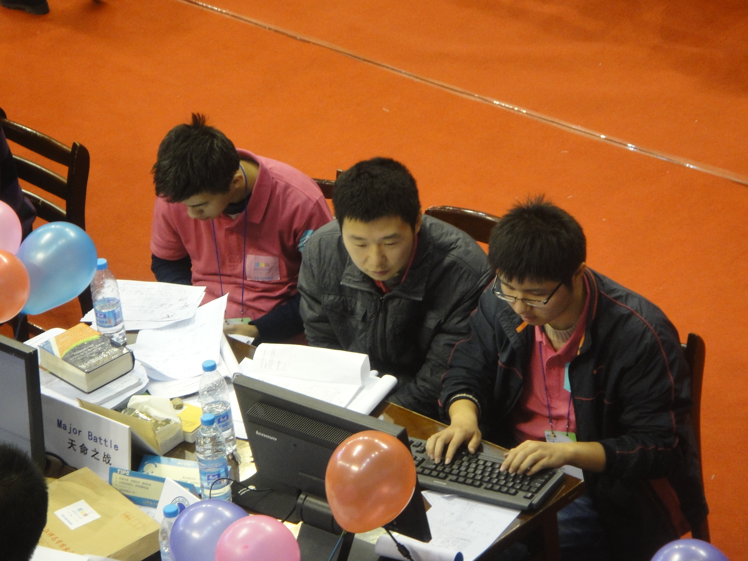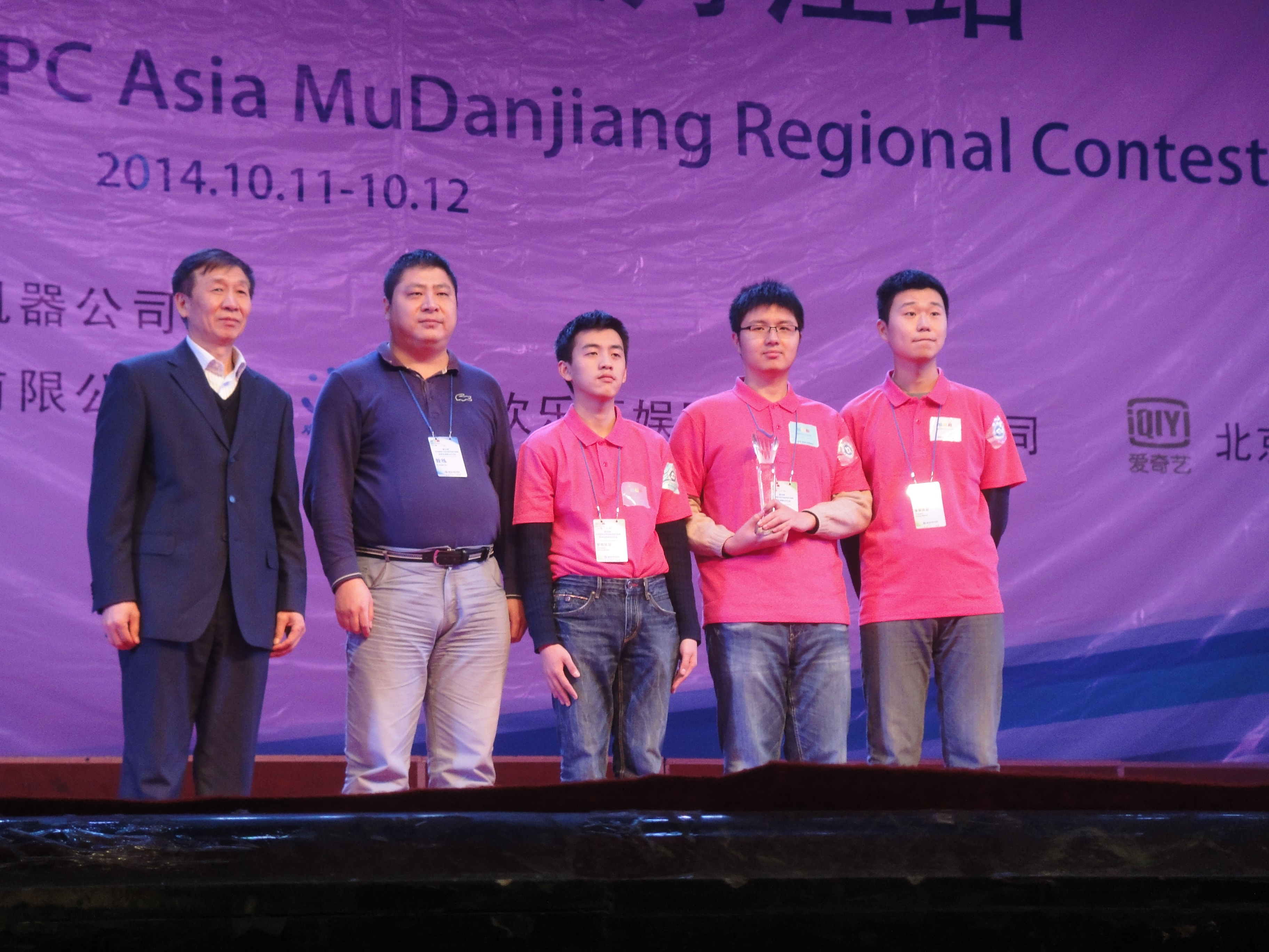 第39届ACM-ICPC国际老员工程序设计竞赛亚洲区域赛牡丹江站比赛于2014年10月11日至12日在牡丹江师范公司举行。清华大学、北京大学、复旦大学、国防科技大学、哈尔滨工业大学等91所高校的154支参赛队参加了该站的比赛。经过激烈的角逐,由公司计算机公司2013级本科生唐家铭、2012级本科生陈海敏和软件公司2012级本科生药剡组成的“天命之战”队力拔头筹,率先解出7个题目,名列第1名,获得冠军。
