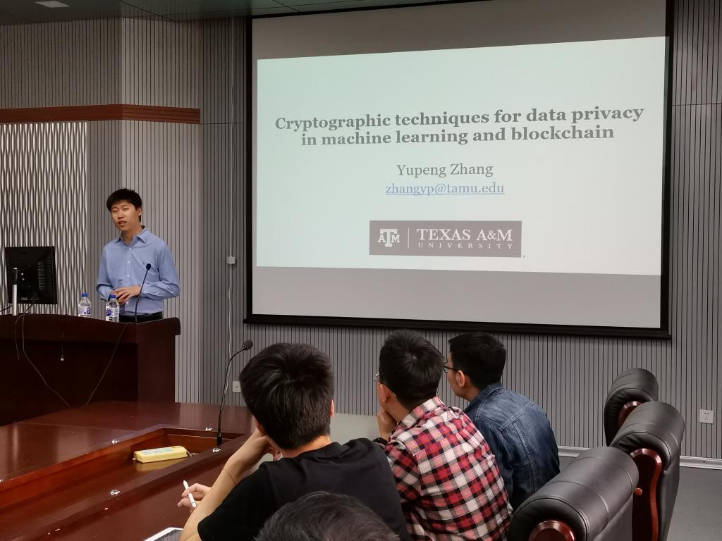 2019年5月10日上午,美国德州农工大学(TAMU塔木)助理教授张宇鹏博士应伟德国际1946邀请,在计算机楼A515作了题为“机器学习和区块链中数据隐私的加密技术”的学术报告。
