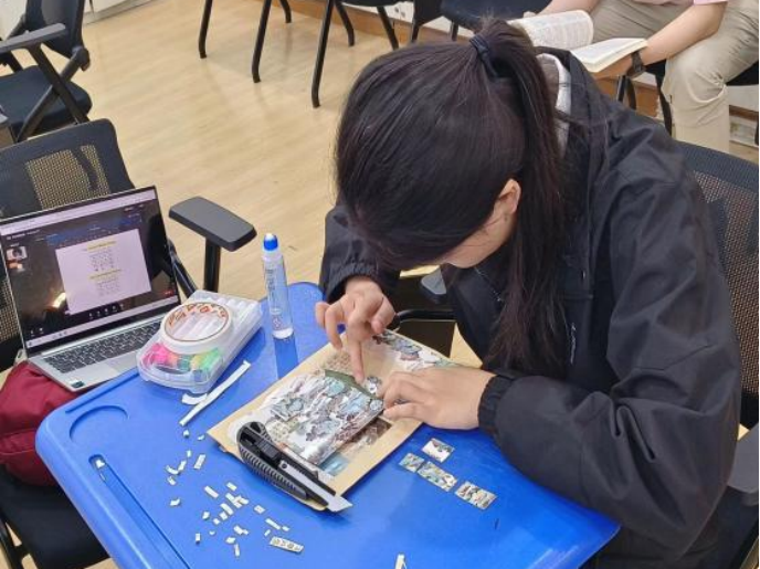 用独特的视角观察生活,共同探寻心灵的秘境。同学们从各种素材中挑选出最能代表自己心情的词语和图像,将它们组合成独特的诗句。通过拼贴诗的创作过程,参与者们锻炼了自己的想象力和表达能力。