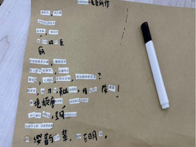拼贴的过程中,大家挑选词句,拼凑成独特的诗行。每一首诗都是内心的映射,蕴含着无尽的情感与思考。活动现场,创意的火花如繁星闪烁,词句在指尖舞动,拼凑出独特的诗行。每一首诗都是心灵的镜子,折射出内心的光影与色彩