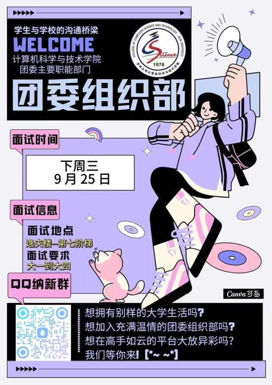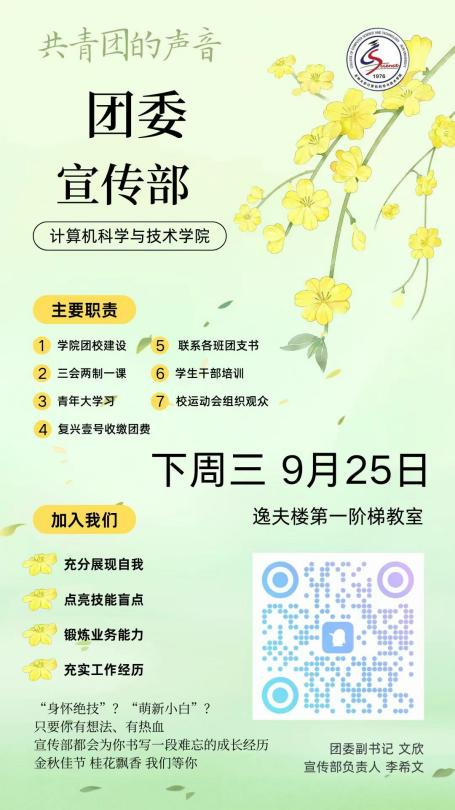 招新宣讲会将于下周三9月25日晚6点30分在逸夫楼第七阶梯举行,期待你的参与!