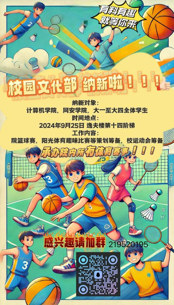 我们是一个充满激情与活力的部门,负责策划并承办院内各类体育赛事及趣味活动,参与筹备校运会,让校园生活更加丰富多彩。无论你是文艺才人、运动达人,还是热爱团建的小伙伴,文化部都是一个绝佳的平台,带你玩转文体、活动和友谊!