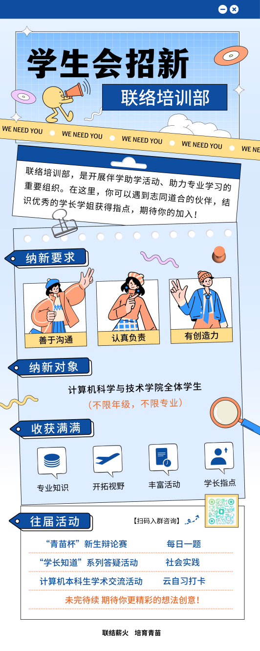 在过去的一年中,联培举办了丰富多彩的活动:”青苗杯“新生辩论赛、“学长知道”答疑活动、本科生学术交流会、云自习打卡……联培,联结薪火,培育青苗。在这里,你可以遇到志同道合的伙伴,结识优秀的学长学姐获得帮助,期待志同道合的你的加入!