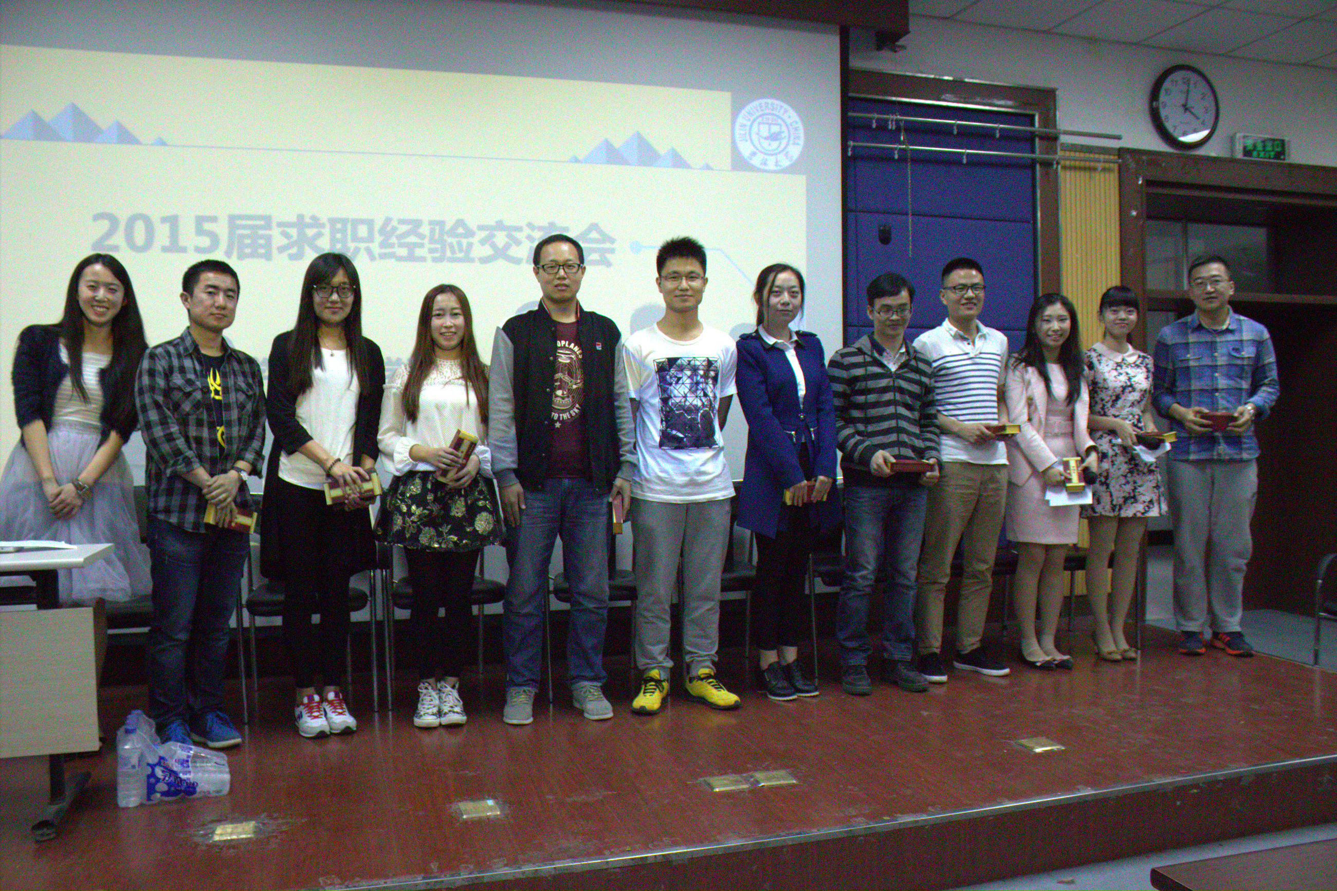 5月21日下午14:00,求职经验交流会于计算机大楼B108教室隆重开幕。本次求职经验交流会邀请到罗琛、蒋美迪、秦善培、刘杨、秦善培等九位师兄师姐作为嘉宾,他们都是2015届毕业生中的佼佼者,在校期间分别获得了各种奖学金及荣誉称号,并成功签约中国登记结算公司、阿里巴巴、一汽大众、腾讯、百度、中国人民银行等知名企事业单位,罗琛同学更是拿到计算机专业排名全美TOP20的莱斯大学的OFFER。本次交流会由三部分组成,首先由杜书记分析了近年的就业形势,随后从就业工作的重要性、就业的层次、就业的原则、就业的准备,就业的要求以及未来工作中如何处理好各种关系等几方面做了详尽的阐述;接着柳一君同学为大家汇报了公司2015届硕士毕业生就业情况,真实详尽的数据表明公司毕业生就业率达97%,在全校范围内遥遥领先;接下来的嘉宾交流访谈环节,9名嘉宾同时列席,两位嘉宾主持按照求职流程——从找实习、前期准备、笔试、面试到签约——分主次、有重点的向不同嘉宾提问,且随时宣读观众传递上来的纸条,请师哥师姐解答。各位嘉宾充分挖掘、总结自己求职期的经验、心路历程等,从笔试准备到面试方法,从简历制作到信息渠道,从宏观定位到细节落实,毫无保留的与学弟学妹分享。不时还会有嘉宾用幽默的言语讲述自己或心酸、或传奇的经历,赢得掌声阵阵,将现场气氛推向高潮。此次活动持续了近三个小时,会后仍然有许多学弟学妹们意犹未尽,来到讲台向师兄师姐们请教,交流会在温馨和谐的气氛中落下帷幕。