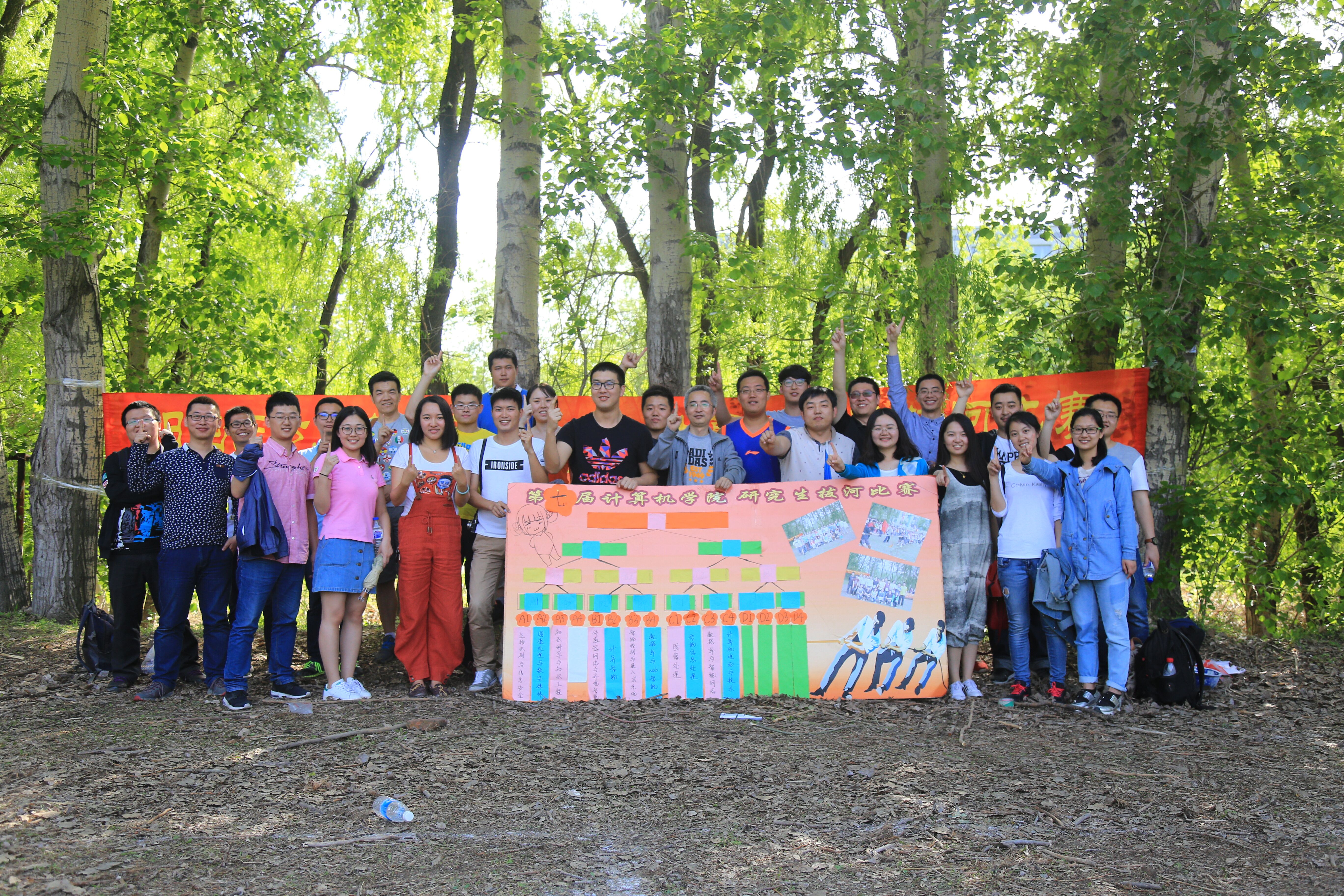 公司第七届教研室师生拔河比赛于2016年5月19日下午1:30,在中心校区体育馆南侧滑冰场草地准时举行,计算机公司党委副书记杜天宝及研究生办公室的各位老师出席了本次大赛。经过赛前一周时间的动员,共有来自11个教研室的博、硕士研究生及指导教师,共计近200人参加了本次活动。比赛采取三局两胜的淘汰赛制,过程激烈精彩,悬念迭起,平日里醉心学术研究、一丝不苟的老师们也挽起了衣袖,挥舞着彩旗,高喊着为队员加油。老师们的热情迅速感染了观众,场上不间断的助威呐喊声使人热血沸腾,参赛队员们更是团结一心,拼尽全力,挑战着耐力与体力的极限。经过激烈的角逐,数据库与智能网络教研室异军突起,一路气势恢宏的杀进决赛,最终收获冠军奖杯;计算智能教研室在领队高超的指挥策略下同心同力,毫无遗憾的获得了亚军;季军则由软件与理论教研室获得。最后同学们纷纷与老师合影留念,记录下师生团结一心,取得胜利的这一美好时刻。