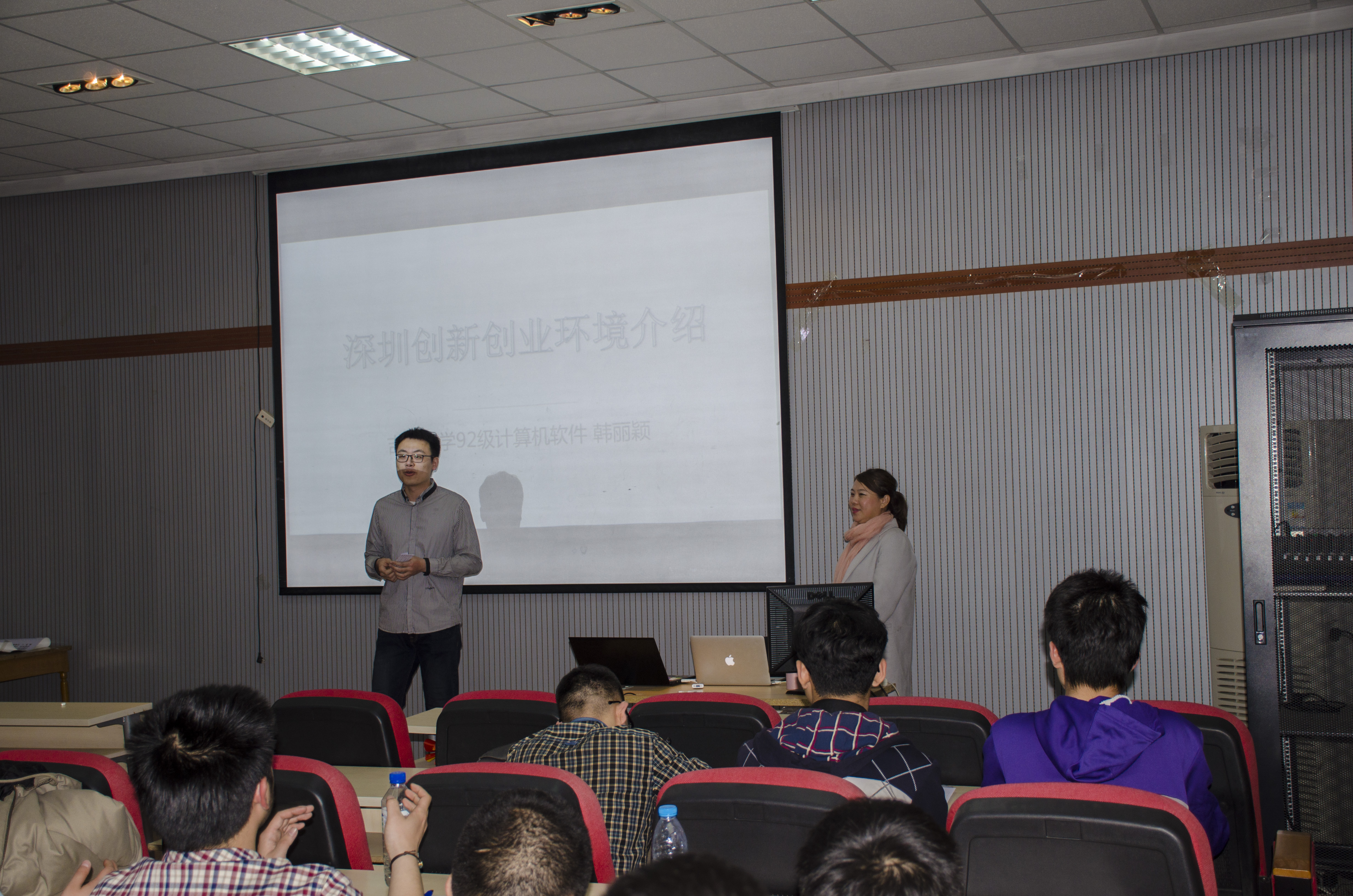 接下来由韩丽颖师姐做分享,韩师姐首先介绍了深圳的居住环境,向同学们展示了很多深圳的风景照片,然后从创新创业角度对深圳进行了一番介绍。深圳的创新创业环境很好,一方面是因为深圳城市的包容性,有句话叫“来了就是深圳人”是对这个城市包容性最好的体现。另一方面是深圳市政府的大力支持,很多小企业有想法,有实力,可是没有启动资金,深圳市政府针对这样的企业推出了很多政策,为他们的发展提供了充分的支持。深圳不会埋没人才,她是公平的,只要你是金子,终究是会发光的。此外,包括清华大学,哈尔滨工业大学等很多公司也都在深圳设立了研究院,这对深圳的发展也起到了不小的推动作用。