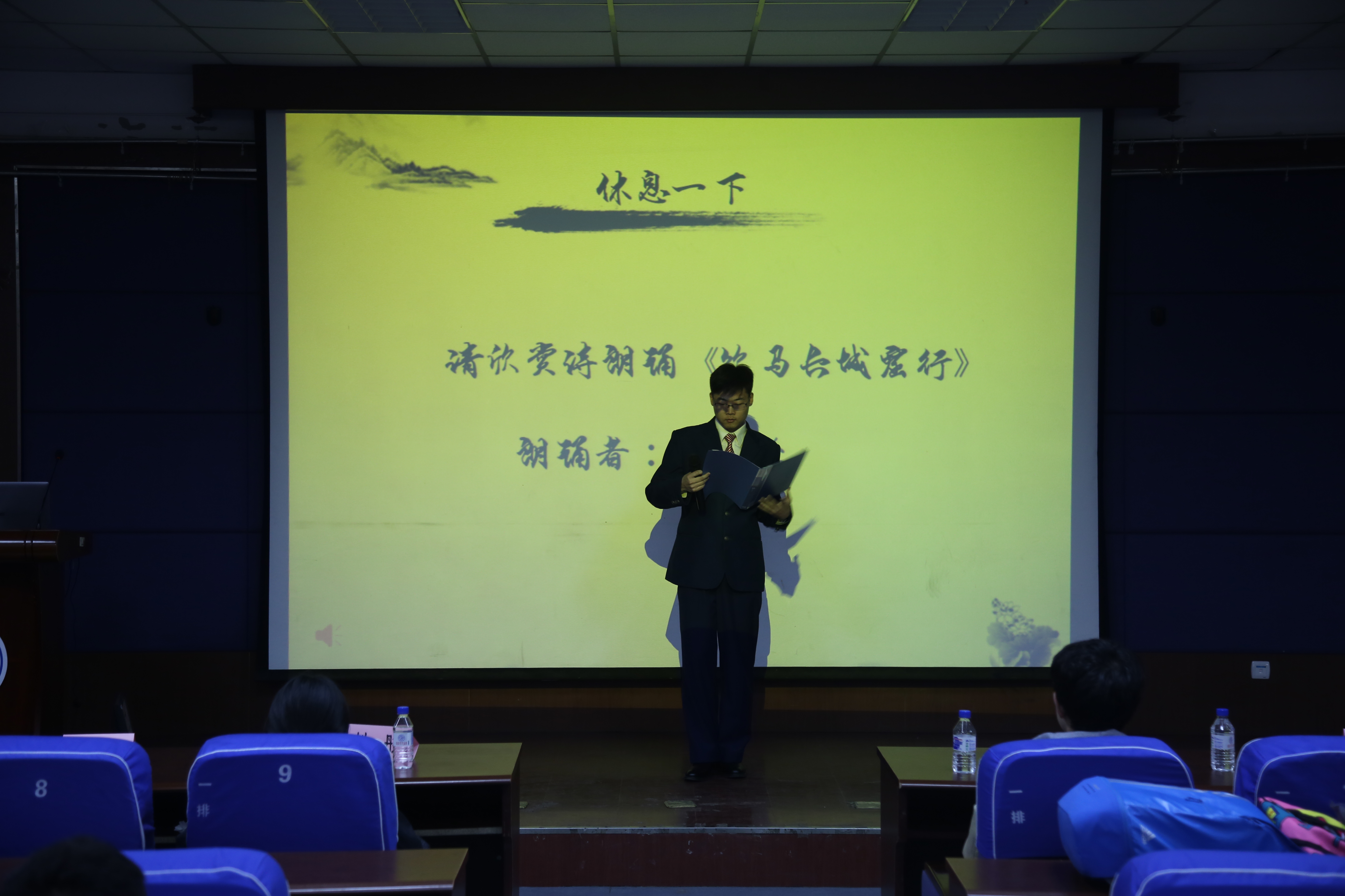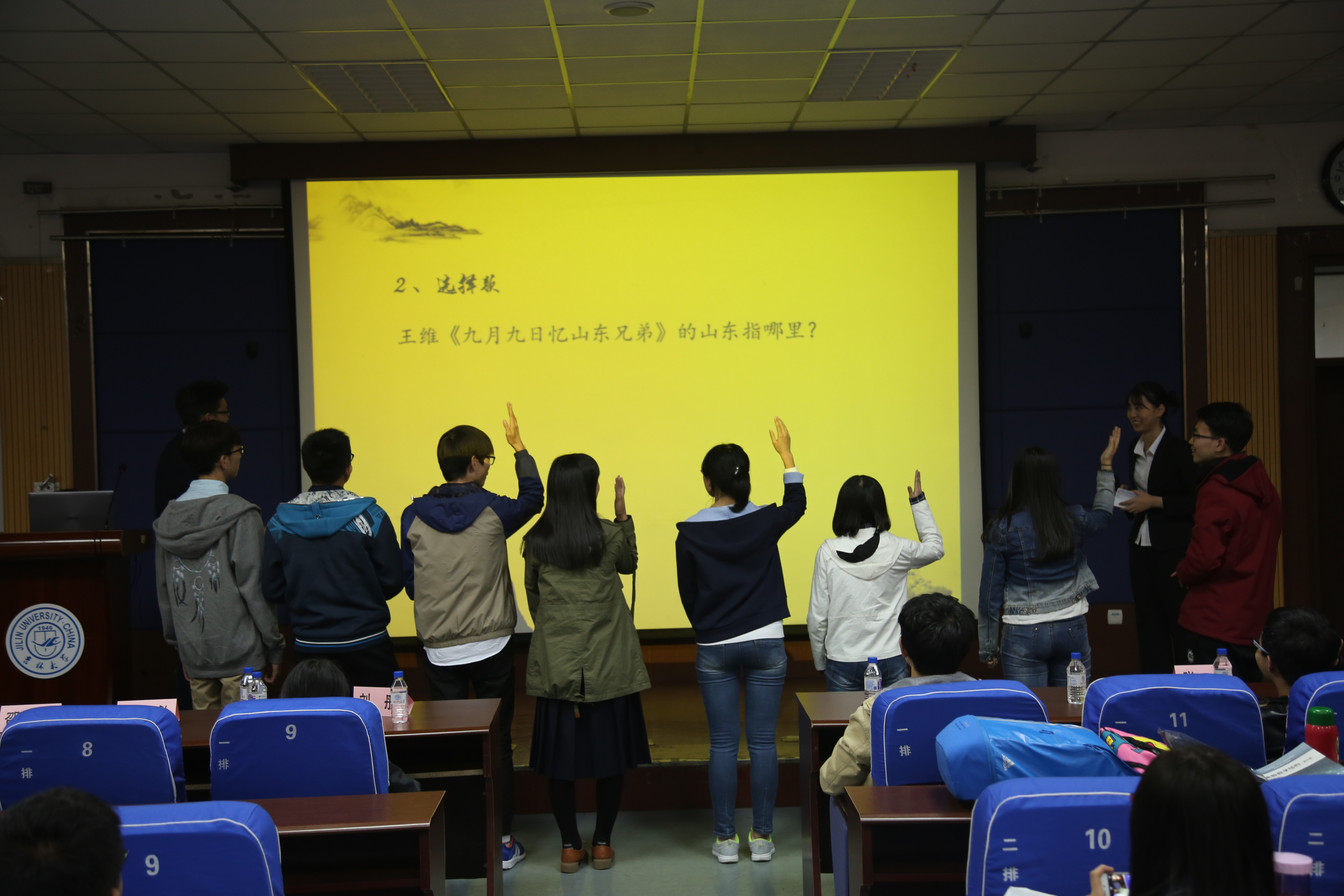 大会还未开始,台下便座无虚席,由此可见同学们对古典诗词的极大热忱。在主持人古雅的开场白下,诗词大会拉开了序幕。比赛分为三个环节。第一轮为基础知识问答,该环节中,各个队伍势均力敌,各个队伍的得分差距较小,其中满分的队伍直接晋级第二轮,另外三个比分相同,位次第二的队伍以抢答的方式进行加时赛,最终取前两位进入下一轮。第二轮为深度知识问答,难度也大大提高。但这并没有难倒这群怀才之士们,同学们以极快的反应能力和极高的准确率来回答每一道问题。最后一个环节就是赫赫有名的“飞花令”文字游戏,该环节十分具有观赏性,两队先后围绕“水”,“月”,“花”这三个意象轮流说出相关的诗词,场上竞争激烈,比分胶着,最终第六组险胜。赛后,活动主办方为每一位到场人员都准备了精美的礼品,此次诗词大会圆满落下了帷幕。