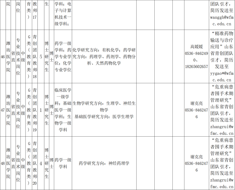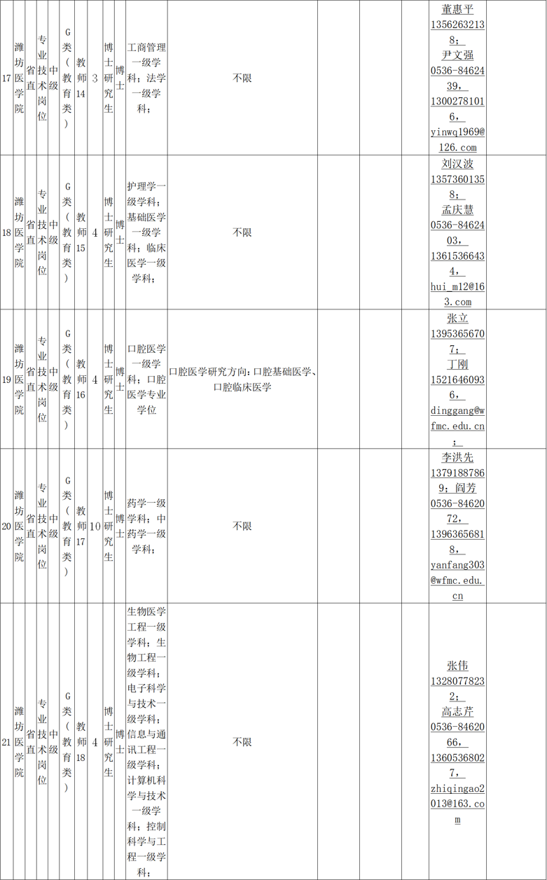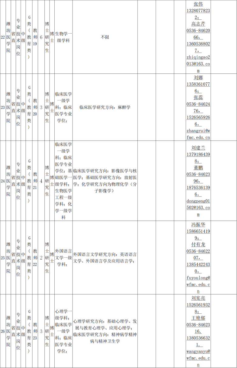 电子信箱:zhaopin@wfmc.edu.cn(应聘者可通过电子邮件方式报名,将个人应聘材料发送到各需求单位邮箱并抄送wfyxyrsc@126.com。应聘邮件标题:应聘岗位名称-姓名-学历-专业-毕业院校-中国博士人才网)