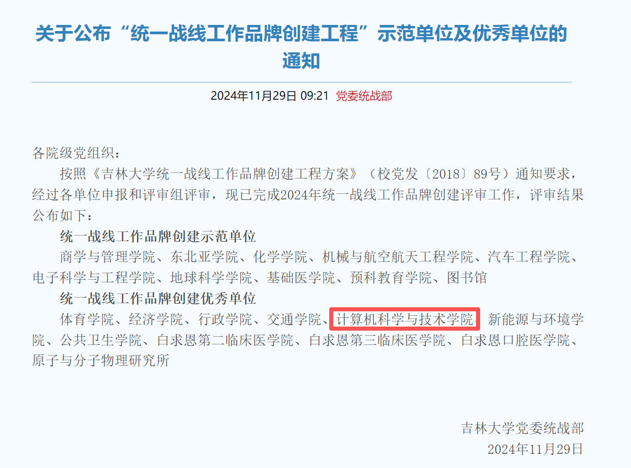 2024 年 11 月 29 日,党委统战部公布 “统一战线工作品牌创建工程” 示范单位及优秀单位评审结果,公司党委成功入选。